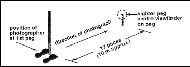- A second peg, is located approximately 10 metres (12 – 17 paces) from the marker peg. This is referred to as the sighter peg. The photograph should be taken from the marker peg towards the sighter peg. The sighter peg is positioned in the camera view such that the photograph area does not include more than 1/3 sky. It is also important to ensure the photo is not taken, facing into the sun, and obscuring the site. With this in mind, a photo facing south is the safest option.
